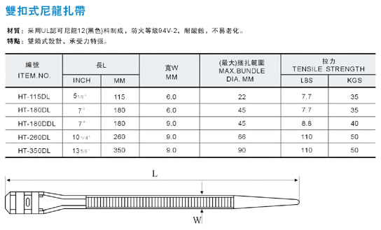 尼龍扎帶故名思意就是用尼龍材料制作的捆扎東西的帶子,設計有止退功能(活扣、珠孔除外)越拉越緊,也有可以拆卸的扎線帶(活扣、珠孔)。材料:尼龍扎帶采用UL(尼龍PA66)材料注塑制成,防火等級94V-2,具有耐酸、耐腐、絕緣不易老化、承受力極強。操作溫度-40℃到+85℃。尼龍扎帶由于產品的特殊性(薄壁、產品注塑流程比較大),其模具、注塑工藝和材料都相當講究、一般新的廠家都需要很長的摸索過程才能生產出合格的產品。